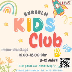 Du bist zwischen 8 und 12 Jahre alt? Dann wäre vielleicht der Kidsclub in Bürgeln etwas für Dich. Wir treffen uns immer dienstags im Jugendclub in Bürgeln. Wir freuen uns über jede:n, die/der Lust hat vorbeizuschauen. Über den Link kommt ihr zur Anmeldung.